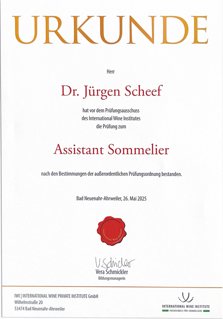 Begleitend dazu durchlief ich meine Fortbildung zum Assistant-Sommelier ebenfalls beim International Wine Institute (IWI) in Ahrweiler.